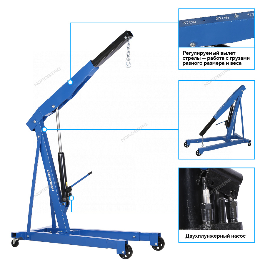 NORDBERG N3731 — предназначен для подъёма и перемещения автомобильных узлов, агрегатов и других грузов массой до 3 тонн. Оснащён гидравлическим цилиндром с ручным управлением, обеспечивающим плавный подъём и опускание груза.