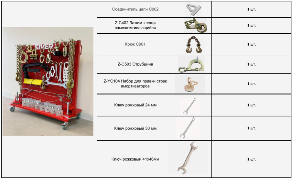 Комплектуется двумя силовыми устройствами башенного типа, диаметр трубы 140 мм, стенка 10 мм, с усилием растяжения 10 тонн. Позволяют быстро и эффективно прилагать усилия в различных направлениях, обеспечивают возможность работы с любой частью кузова в любых плоскостях;