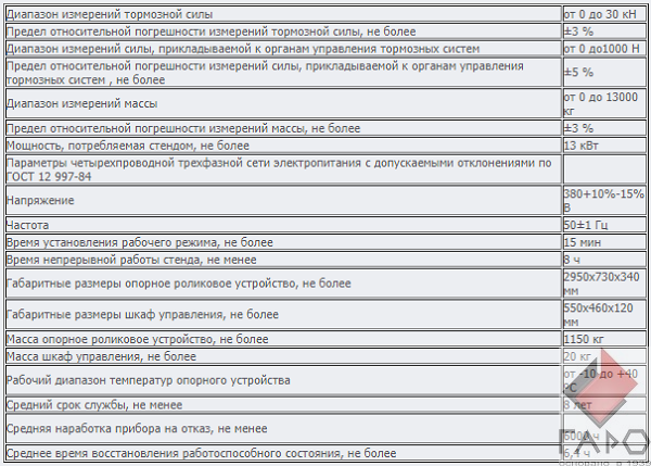 - Автоматическое выполнение измерений и расчет параметров тормозных систем по ГОСТ Р 51709-2001 и согласно требований приказа Министерства промышленности и торговли РФ от 6 декабря 2011 г. № 1677 "Об утверждении основных технических характеристик средств технического диагностирования и их перечня" по следующим показателям: тормозная сила, развиваемая тормозными системами АТС; масса, приходящаяся на ось АТС; усилие, прикладываемое к органам управления тормозными системами АТС.