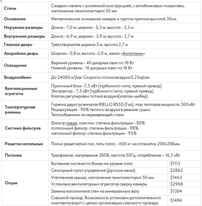 В данном исполнении камера Guangli GL3 LUX комплектуется газовой горелкой из нержавеющей стали Riello RS5D итальянского производства. Мощность горелки составляет 300 кВт, 90 % нагретого воздуха подвергается рециркуляции.